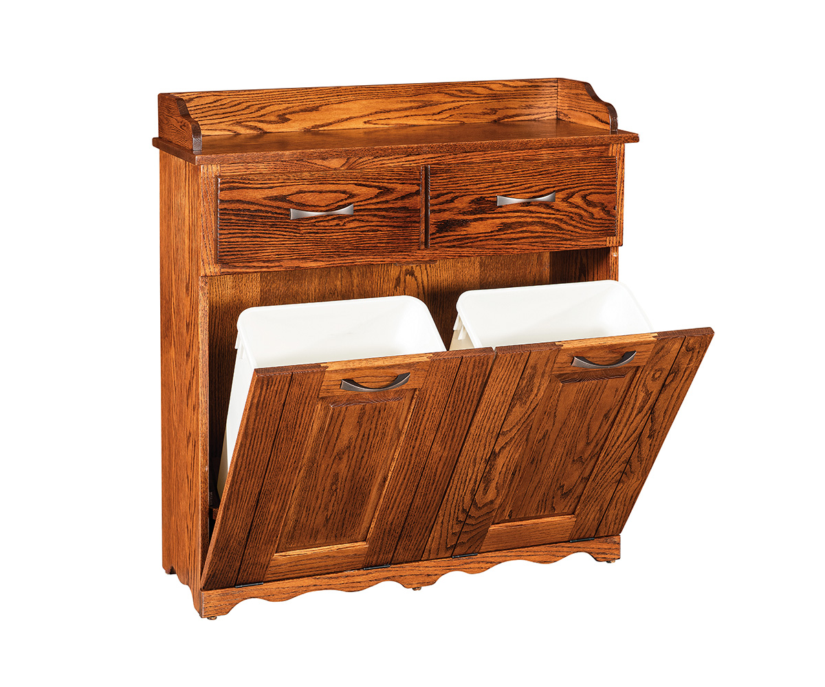 Features: • Dovetailed drawers • Full extension drawer slides • Front panel tilts forward for easy access • Two 35 qt trash cans fit inside