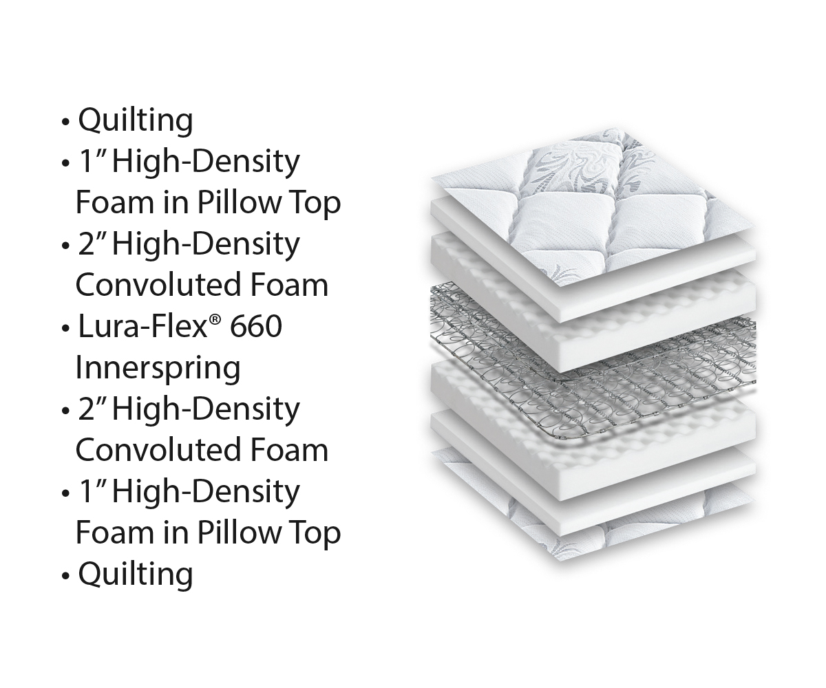Enjoy the benefits of a well-engineered spring foundation with several layers of comforting foam. The Pillow Top consists of a Lura-Flex® innerspring with 4½” of layered foam on both sides (2″ convoluted foam, 1″ foam pillow top, 1½” quilting).