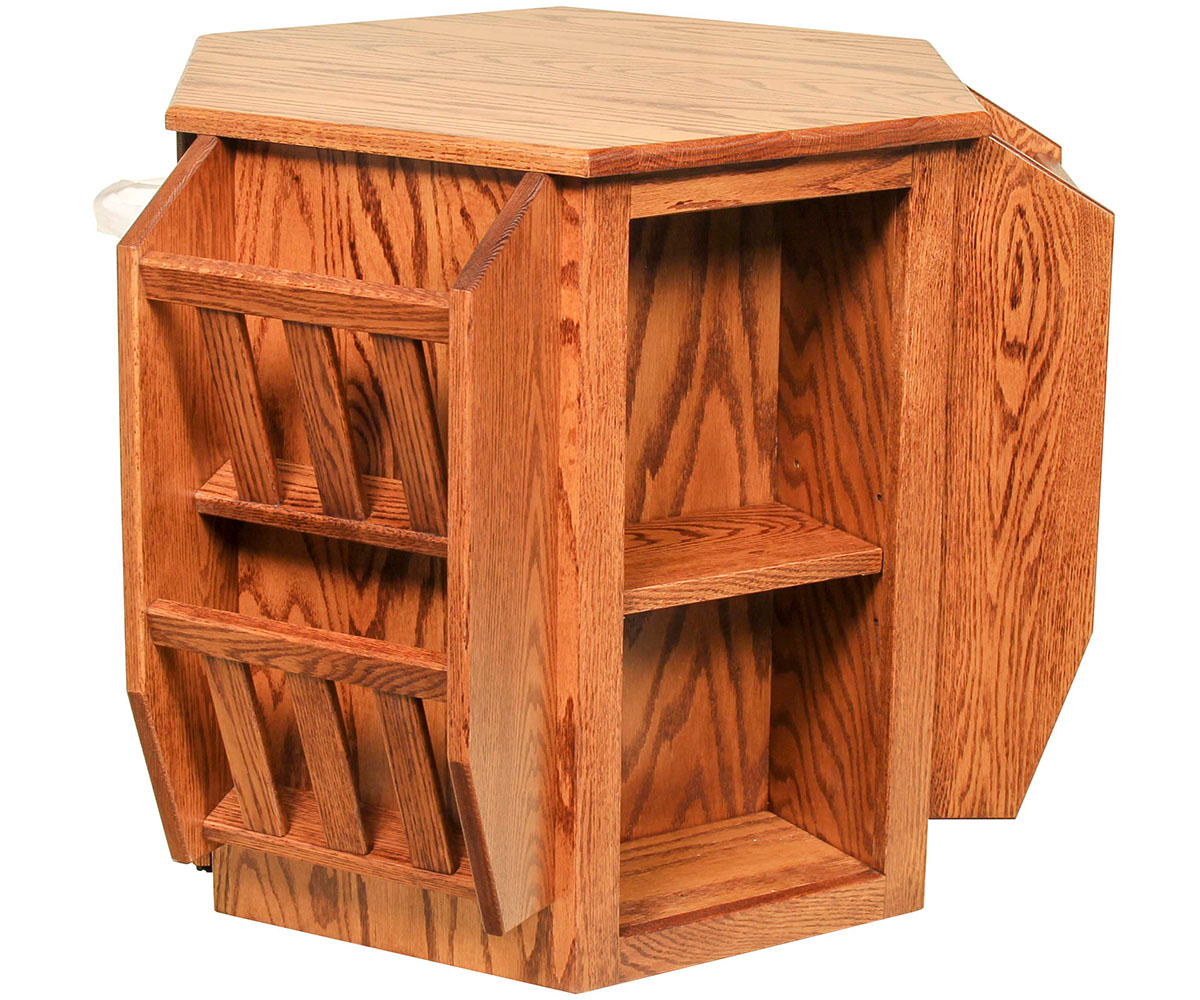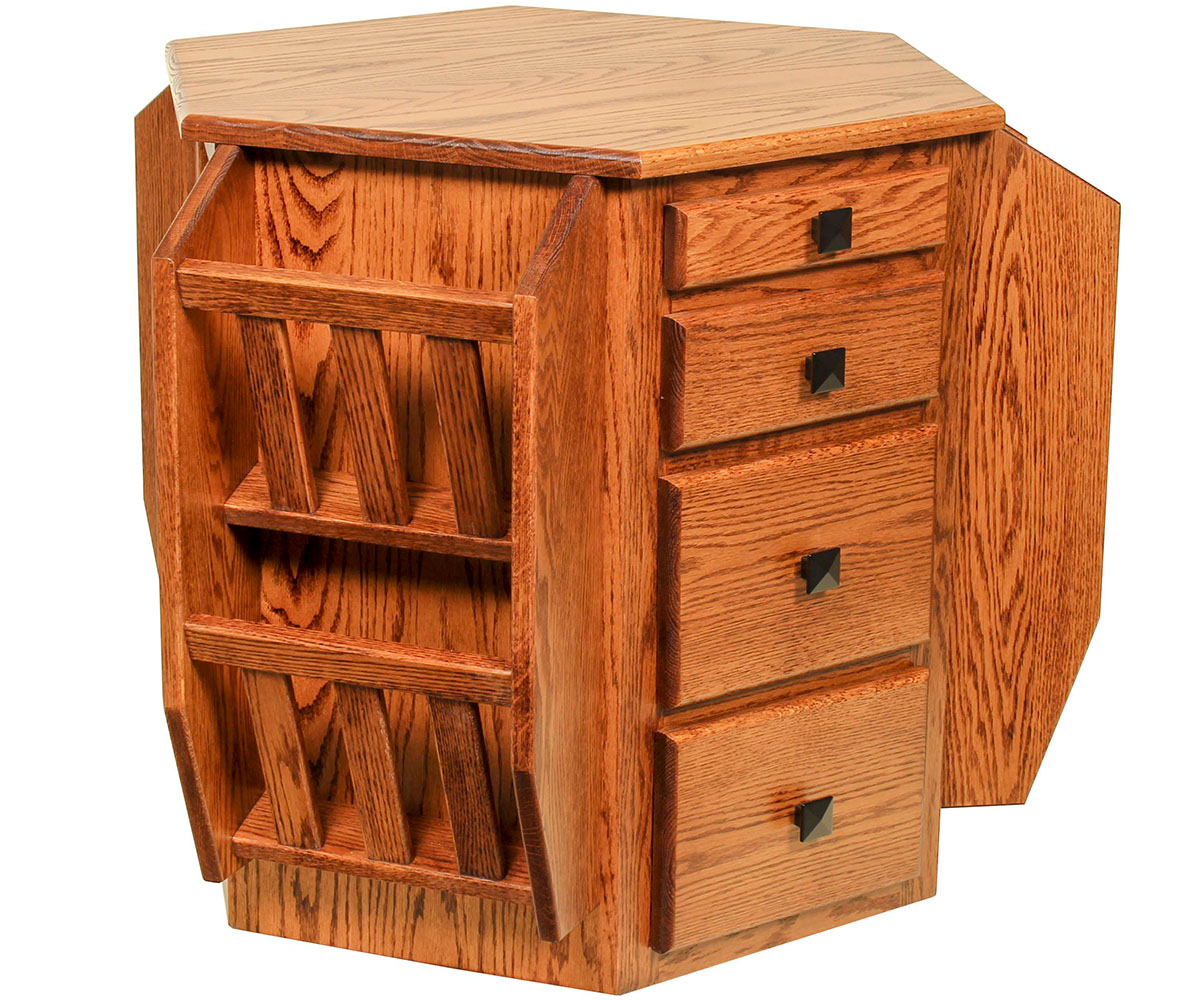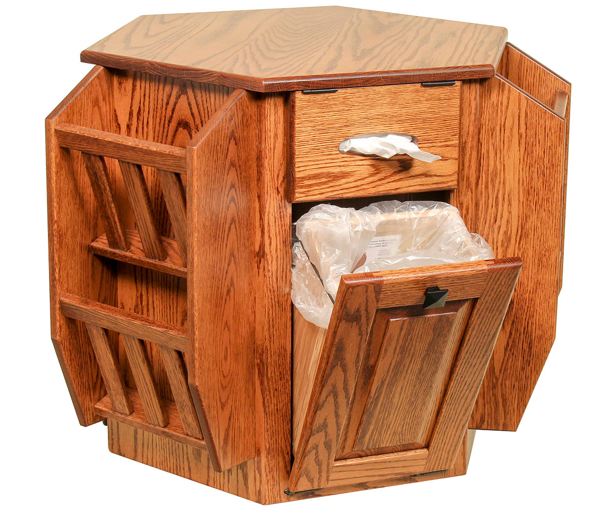 Features: • Dovetailed drawers • Pull out cupholder shelf • Magazine racks • Tissue holder • Tilt out trash bin • Bookshelves